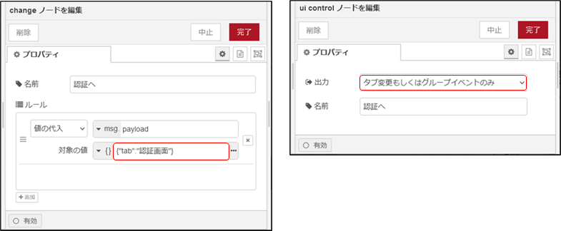ui-controlノードは、ダッシュボードのタブやグループなどの表示切替などの制御に使用されるノードですので、ダッシュボードへの接続(connect)、切断(lost)、タブの移動(change)などの情報を出力してくれます。これを、「切断」ボタンを押さないまま、ダッシュボードから抜けていった端末を検出するのに使用します。
