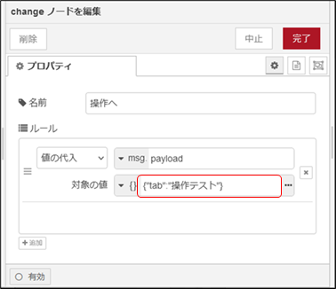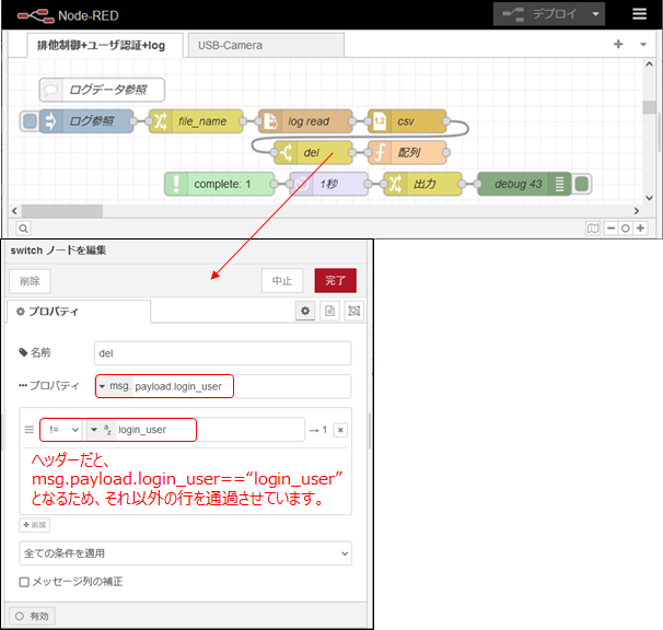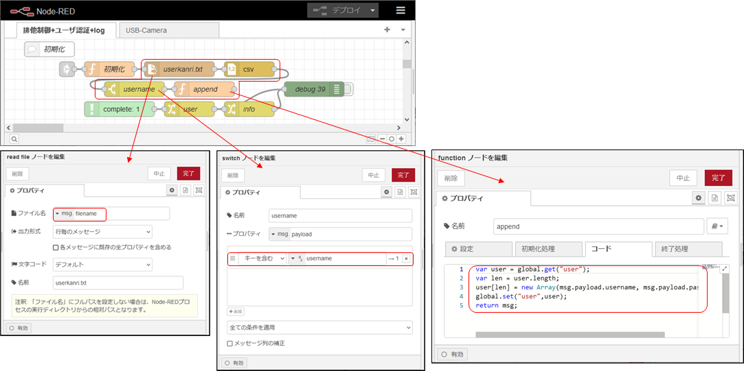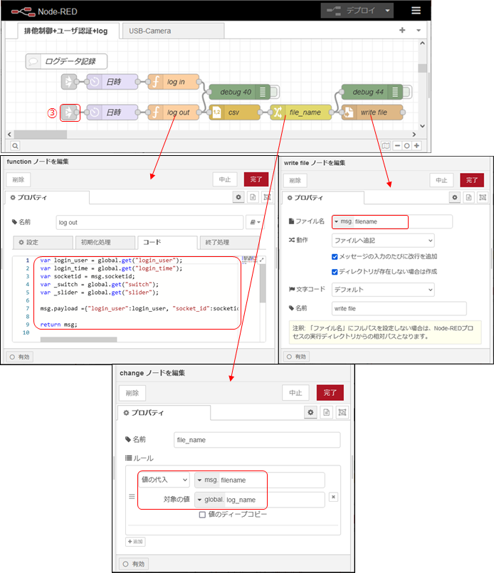 ②のfunctionノードとswitchノードは、「接続」ボタンを押した利用者のsocketidが、 socketidの認証記録簿に存在するかどうかを調べています。存在すれば、