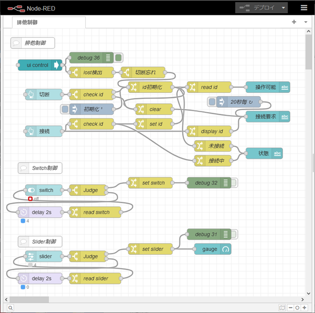 ダッシュボードを表示すると、接続元個別の識別子:msg.scokectidがサーバーであるNode-REDから付与されます。そして、ダッシュボードのスイッチやスライダーを操作すると、操作値(msg.payload)と共に、誰が操作したのかを知らせるために、msg.socketidがノードから出力されます。この機能を使い、ユーザー端末を識別し、特定の端末からの操作だけを許可するようにフローを記述します。