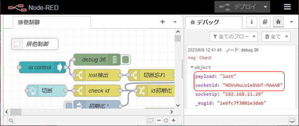 ダッシュボードを抜けた端末があった場合のui-controlノードの出力を以下に示します。payload: “lost”, scoketid: “NOVvHuLWieGVWT-MAAAB”のように表示されます。これを利用して、msg.payload:”lost”の場合のmsg.socketid:が、global.socketidと同じだったら、「切断」し忘れと判断して、global.socket.idを初期化します。