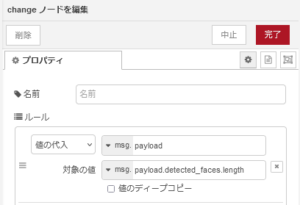 検出した顔の情報(ボックスの情報)はmsg.payload.detected_facesにarrayとして返されますので、その長さをmsg.payload.detected_faces.lengthとして取得します。下記の事例では16(数字)が返されます。