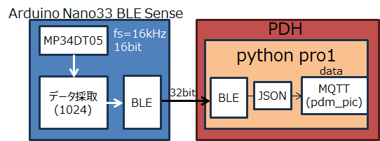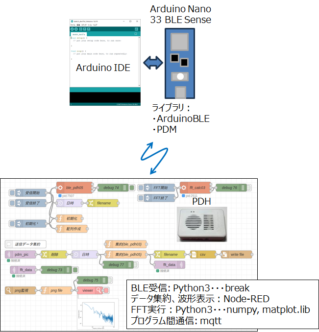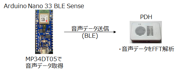 Arduino Nano 33 BLE Senseには、デジタルマイクロフォンMP34DT05が搭載されており、16kHzサンプリングで16bitの符号付整数(32,768~-32,768)として出力されています。この音声データをBLE(Bluetooth Low Energy)を使って、PDHに送信し、PDHでFFTを行うシステムの動作確認を行います。