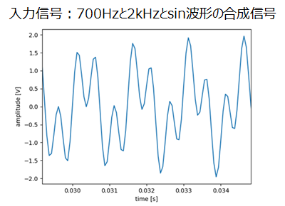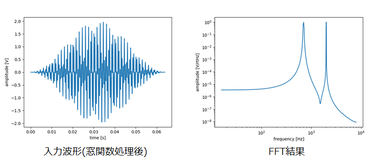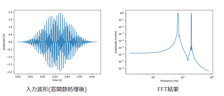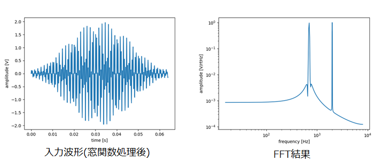 入力信号として、700Hzと2kHzのsin波を合成した信号を使い、fs=16kHz、サンプリング数=1,024個でFFTを実施しました。