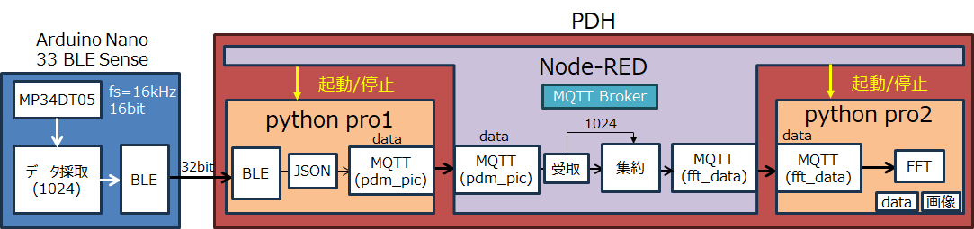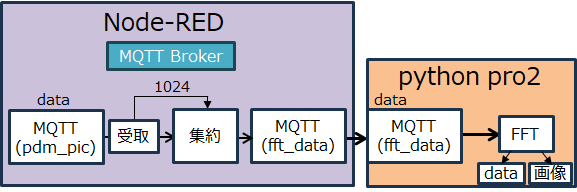 PDH側では、前段のpythonプログラムがBLEで受け取ったデータをJSON形式に変換してNode-REDに送ります。Node-REDは、受け取ったデータを1024個に集約して後段のFFT用pythonプログラムに送ります。 FFT結果のデータと画像は、タイムスタンプを付けたファイル名のファイルとして保存されます(データはJSON形式、画像がpng形式)。PDH側のプログラム間のデータ転送はMQTTを使っています。Brokerは、Node-RED上にBrokerノードを配置しています。