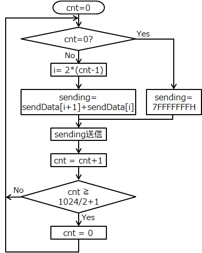 cnt=0ならば、sending=7FFFFFFFHを送ります。cnt≠0ならば、MP34DT05の16bitデータ2つを合わせて32bitにして送信します。cnt=513になったら、cnt=0に初期化します。従って、513個の32bitデータを送ることになります。