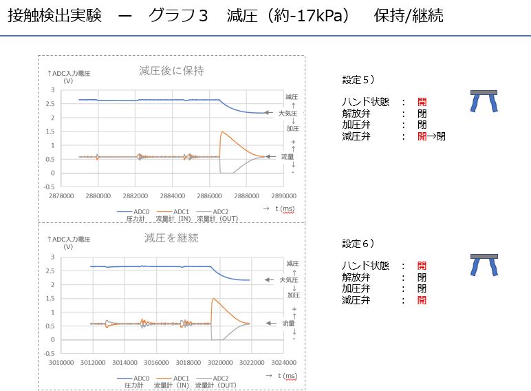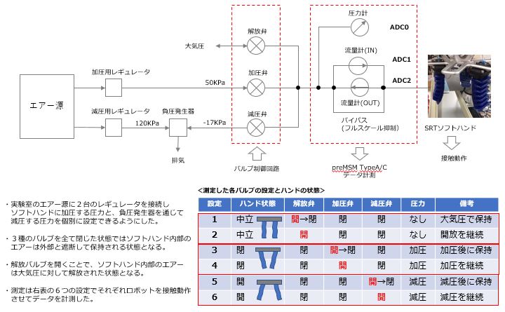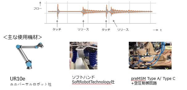 SIP第2実証実験室に設置したUR社製の協働ロボットUR10eとSRT社製ソフトハンドを使用して接触検出が可能かどうかを確認するための実験を行なった。ソフトハンドに接続したエアー回路に圧力計とフロー計の2種類を設置したが、結果として圧力計よりもフロー計を用いることで接触検出を行える事を確認できた。また、値に多少の差はあるが加圧・減圧・大気圧の状態に関わらず接触の検知ができた。