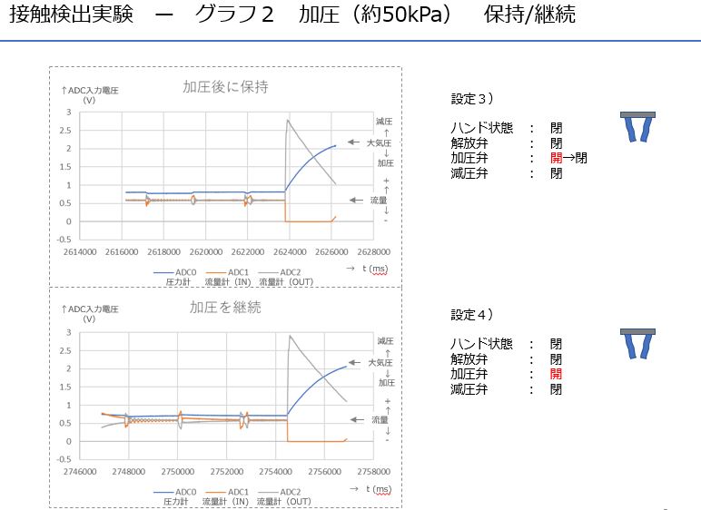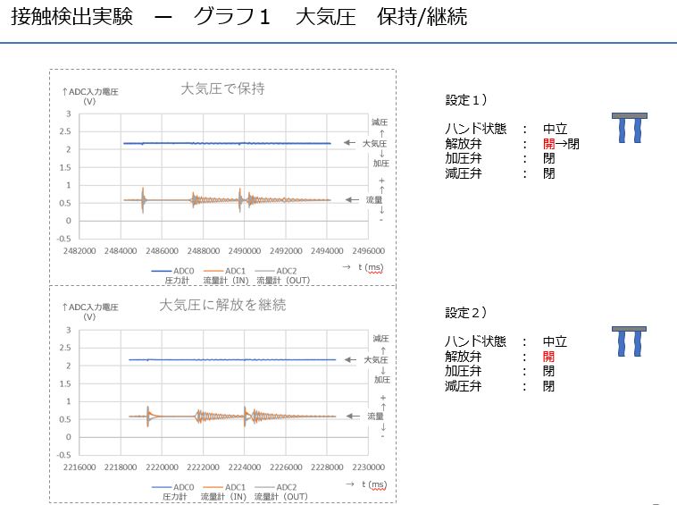空気圧駆動系に取り付けたフローセンサをモニタしソフトハンドの接触を検出