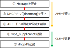 CLモードヵらAPモードへの移行と同様に、1行目と2行目が、hostapdとdnsmasqを停止するコマンドです。3行目が、APモードに移行する際に3行目と4行目のコマンドで設定したIPアドレスを消却するためのコマンドです。そのあと、4行目と5行目でそれぞれ、wpa_supplicantとdhcpcdを起動しています。この際に、準備で記載したwpa_supplicant.confとdhcpcd.confの内容が使用されます。