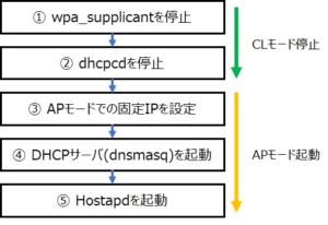 1行目と2行目が、それぞれ、wpa_supplicantの停止、dhcpcdの停止を実施しています。3行目と4行目が、上記フローの③APモードでの固定IPを設定に相当します。赤字のアドレスは、各自の環境の値に変更してください。5行目と6行目で、dnsmasqとhosapdを起動しています。