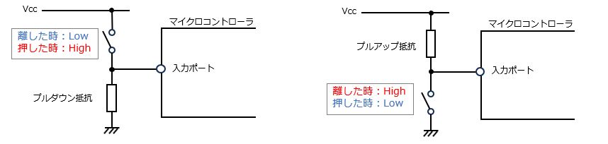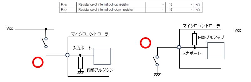 3.マイクロコントローラの種類やポートによっては、マイクロコントローラ内部で内蔵プルアップ/内蔵プルダウンの抵抗を利用することができます。この場合も、マイクロコントローラのデータシートを確認し、対象のポートでプルダウン/プルアップが使えるかを確認したうえで、ソフトウェアで有効化して利用します。