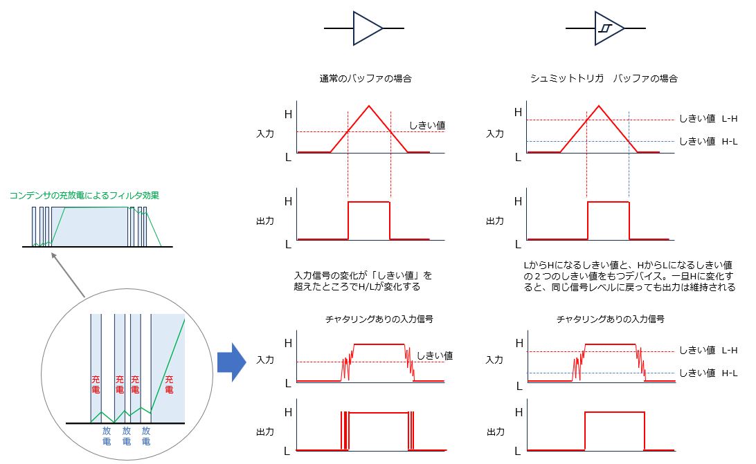 上の図では接点の接触が安定しない期間をギザギザの波形で示していますが、機械的にボタンが押し下げられていく中で、接点同士が触れ合って導通を開始しようとしても接点を押される圧力が不足している微小な時間に不安定なタイミングがあります。接点の信号は第一段階として簡単なCR回路を組み込んで、充電カーブと放電カーブにより急峻な変化をしないように処理します。次に、第2段階としてシュミットトリガバッファという素子でチャタリングを取り除きます。