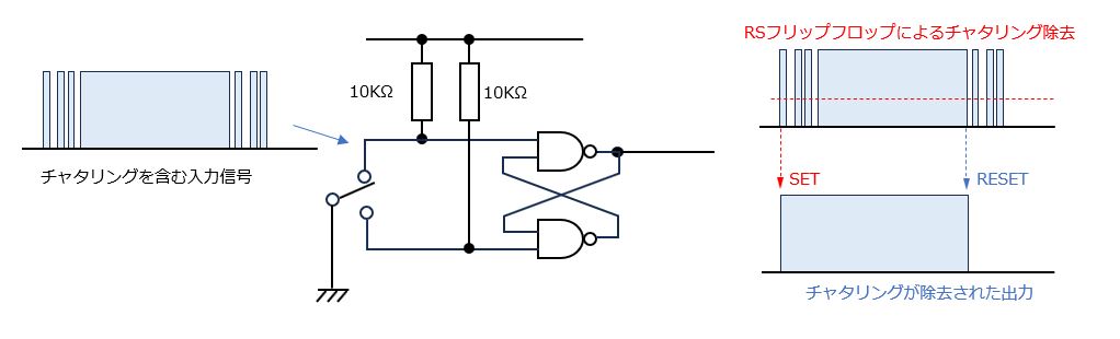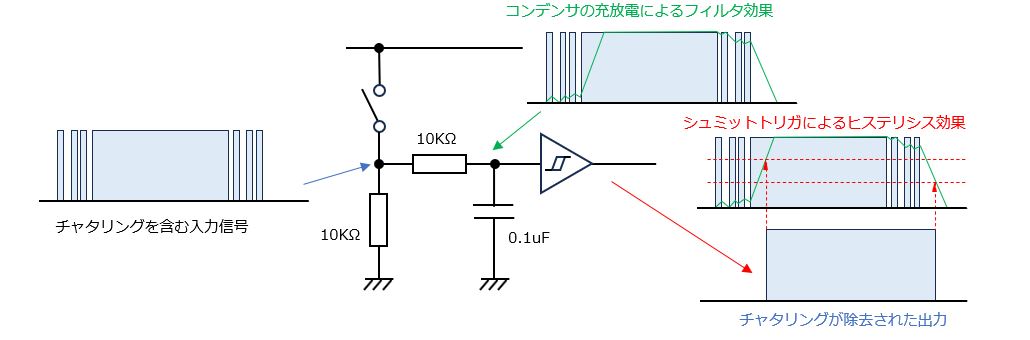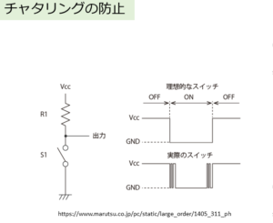 このチャタリングによる誤入力を防止するための回路が、チャタリング防止回路です。