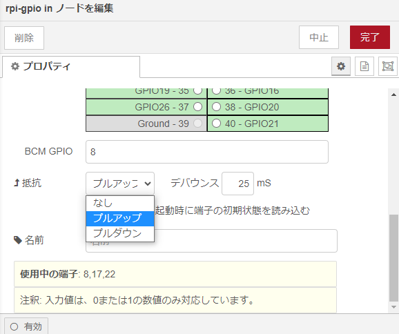 この設定は、例えばRaspberry Pi上で動作するNode-REDの場合、下図のように入力に使用するGPIO inノードにプルアップ/プルダウン/または「なし」を選択する項目があります。