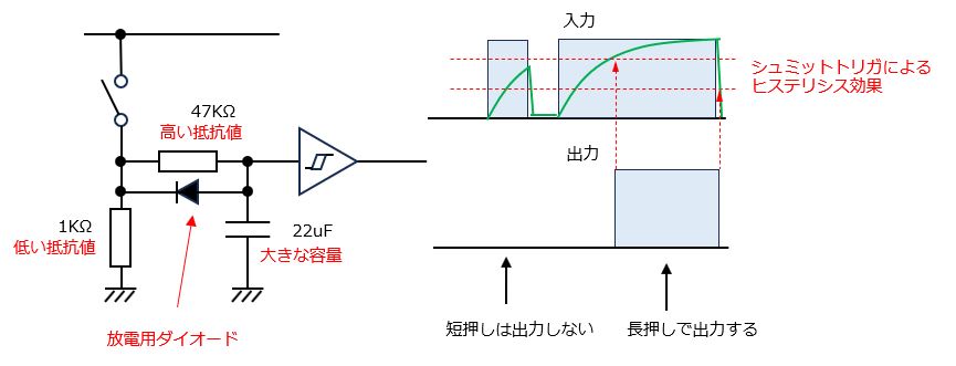 長押し検出とは、上記のスイッチを、ある一定の時間(例えば1秒)以上押し続けたことを検出して、初めて入力信号として取り込む回路です。