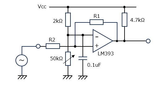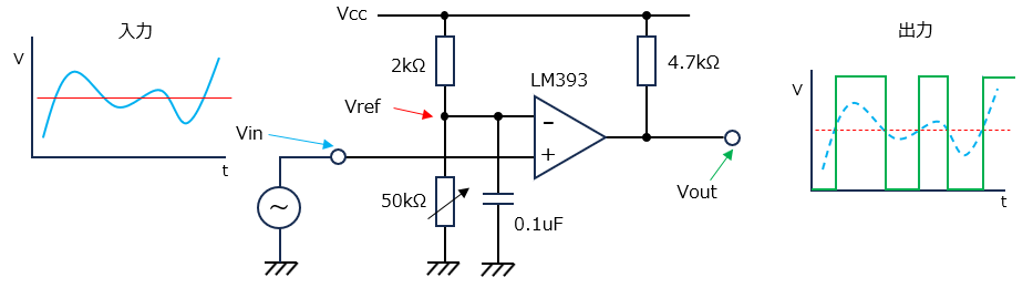 下記の回路例では、LM393コンパレータICの(+)端子に入力信号を加え、(-)端子には可変抵抗器で調整可能な基準電圧(Vref)を加えています。