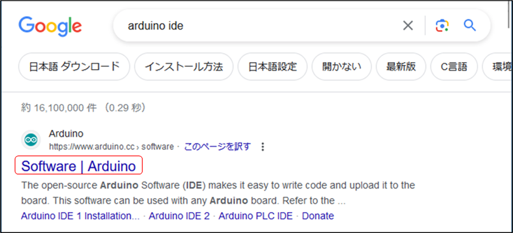 Googleで、「arduino ide」を検索すると、先頭に“Arduino IDE”が表示されるので、クリックして開きます。