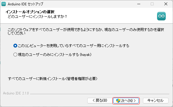 インストールするユーザーを選択する画面が現れるので、いずれかを選択し “次へ”ボタンをクリックします。