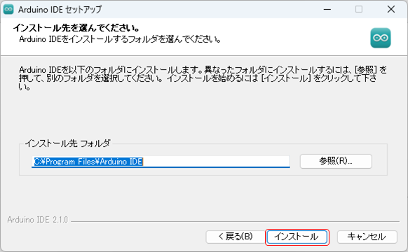 次にインストール先を確認する画面に切替わるので、“インストール”ボタンをクリックします。