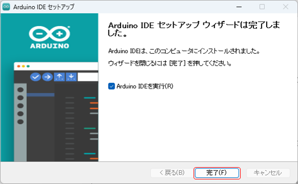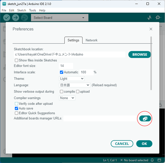 OKを押した後、一度、Arduino IDEを閉じて、再度起動します。