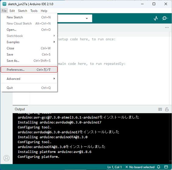 Arduino IDEを開き、図の様に「File」→「Preferences」をクリックします。