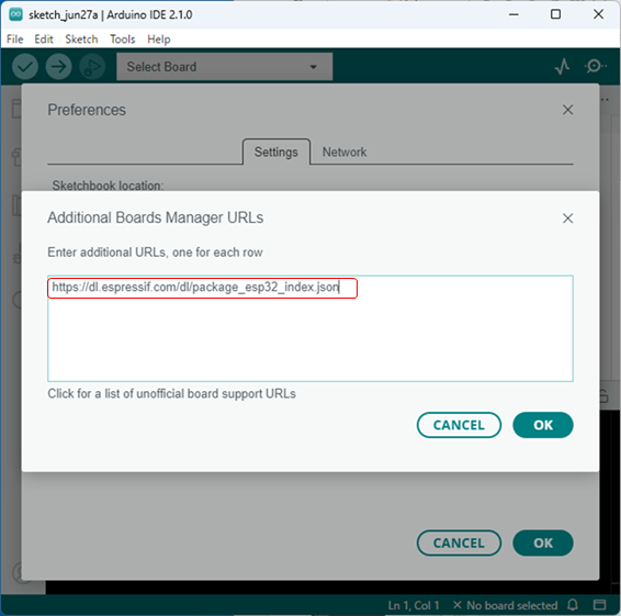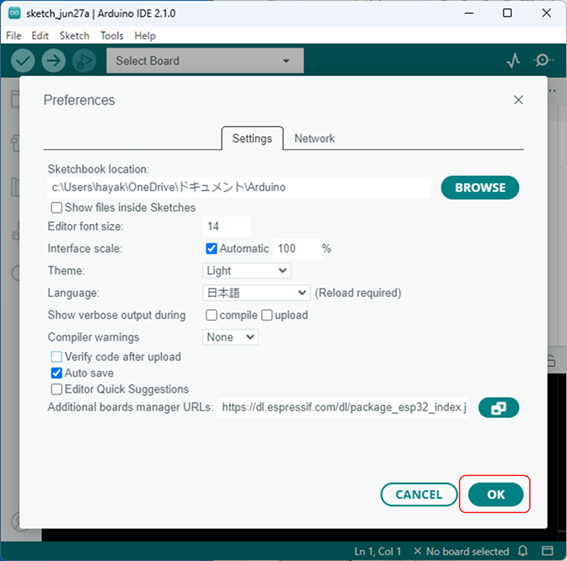 続けて「https://dl.espressif.com/dl/package_esp32_index.json」を入力し「OK」をクリックします。