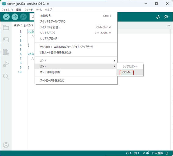 以下の図の通り「ツール」→「ポート」→「COM*」の順にシリアルポートを選択します。