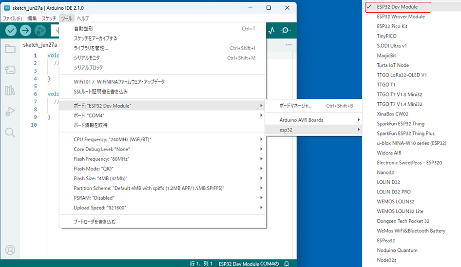 続いて、「ボード」→「esp32」→「ESP32 Dev Module」を選択します。