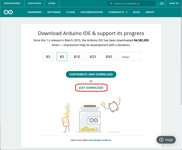 すると、Arduino ソフトウェアの開発への寄付の呼びかけが表示されるので、賛同される方は、各寄付金毎のリンクをクリックし、寄付をしてください。