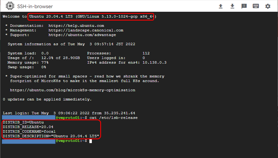 GCP にSSHで接続します。そして、Versionを確認するコマンドを入力します。