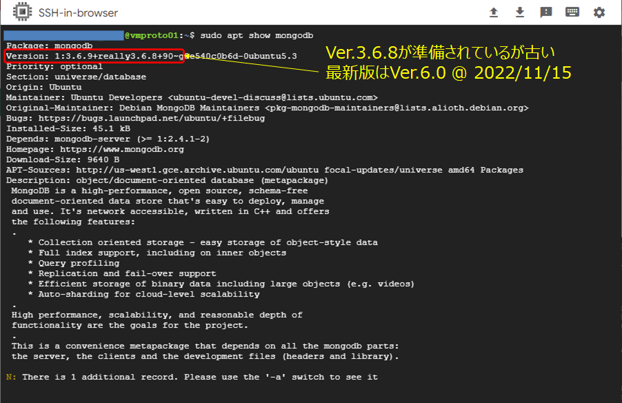 Ubuntu 20.04 LTS に標準でインストールできるMongoDBのバージョンを調べてみます。