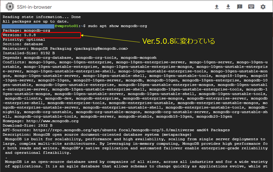 ここで、注意事項は、プログラム名がmongodb-orgとしてデータベースに記載されていることです。以降のインストールで、Ver.5.0は、mongodb-orgとして扱います。