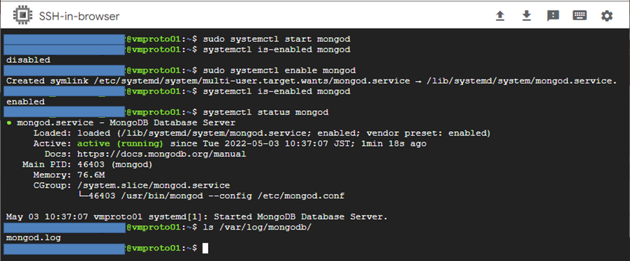 MongoDBを起動するために、以下のsystemctl startコマンドを使ってmongdb を起動します(プロセス名が”mongod”である所に注意)。