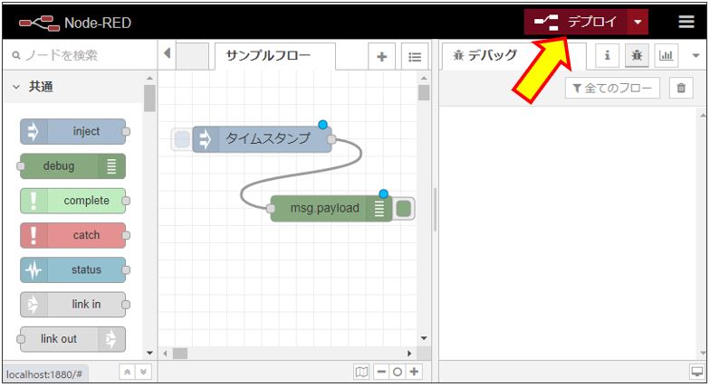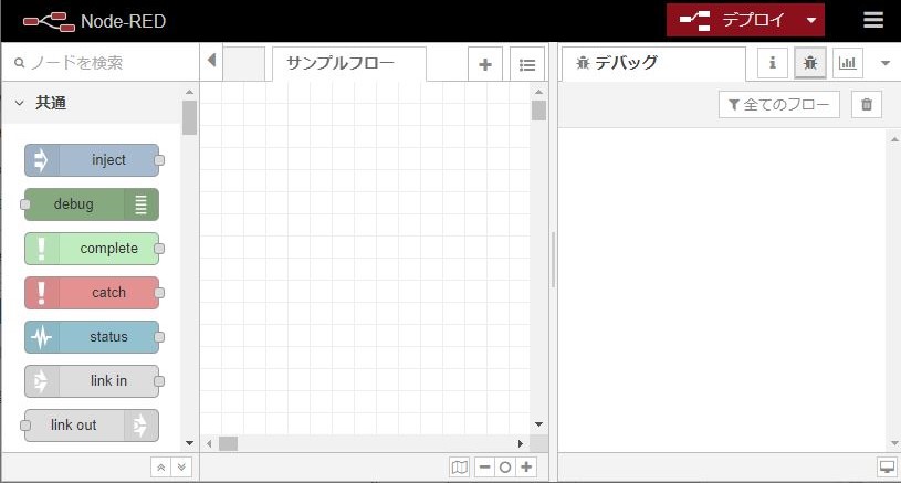 Node-REDをインストールしたマシンでアドレスバーに「localhost:1880」、または「IPアドレス:1880」を入力すると下記のような「フローエディタ」のウインドウが開きます。
