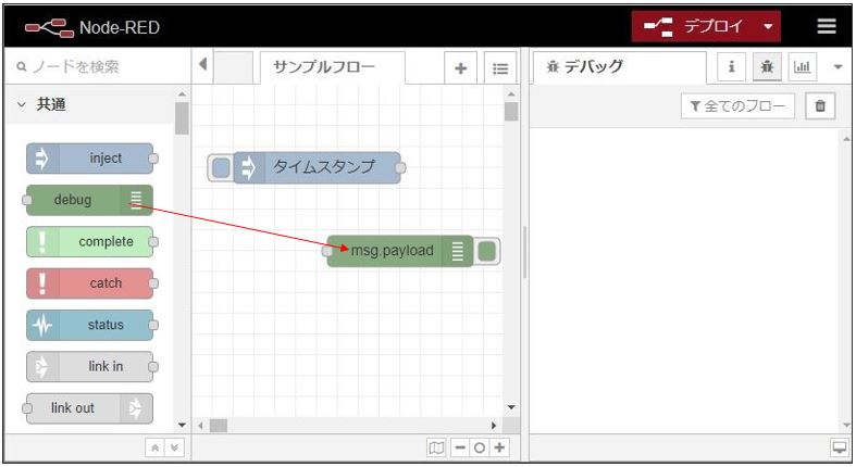 2. 同様に、パレットからDebugノードを探し、ワークスペースに配置します。