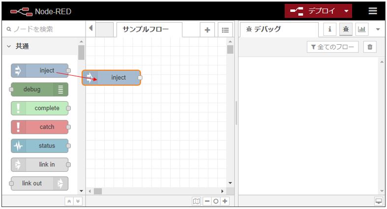 1. パレットからInjectノードを探し、マウスでワークスペースに配置します。