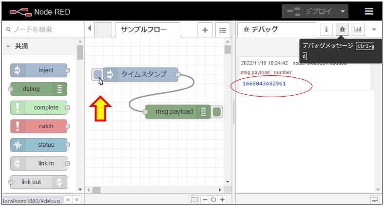 Injectノードの左にあるボタンをマウスで押すたびに、デバッグメッセージのウインドウにタイムスタンプの数値が表示されます。