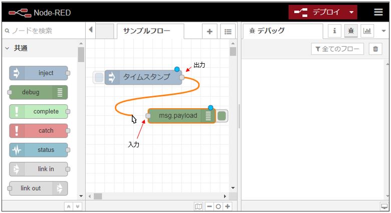 フローを作成する際は、パレットから必要なノードをワークスペースに配置し、ワイヤで接続して処理を組み立てます。