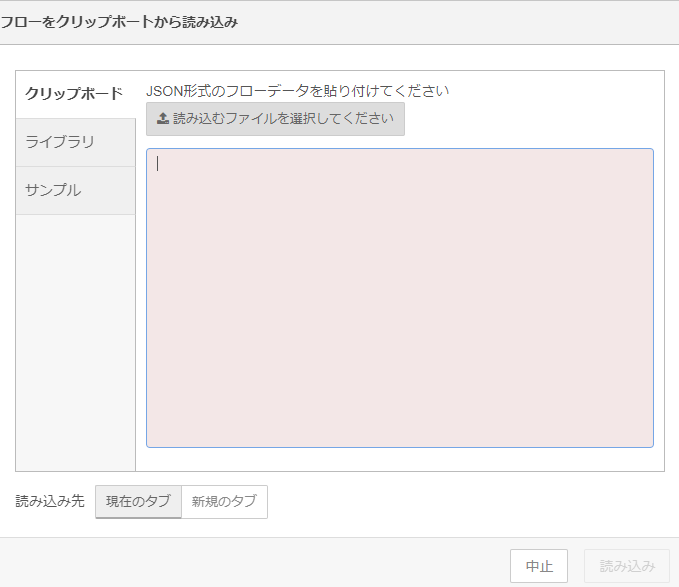 クリップボードにコピーしたフローを使用する場合は、このダイアログのフィールドにペーストしてください。