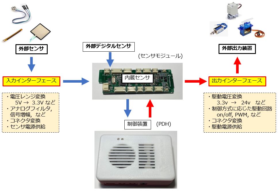 R-CPSを活用する際に、よく必要となるのがインターフェース回路です。R-MSMセンサモジュールにはセンサモジュールに内蔵されたセンサも多くありますが、ADCポートにひずみセンサなどの外部センサを接続したい場合は「入力インターフェース」が必要となります。また、制御装置からのメッセージを受けてセンサモジュールのGPIOポートなどを操作する事もできますが、その信号を元にアクチュエータを動かす際にも「出力インターフェース」が必要となります。