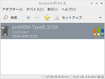 ネットワークに接続されたPCから、VNCでゲートウエイにアクセスし、センサモジュールとペアリングを行います。RapberryPi4の画面左上のラズパイアイコンから、設定→bluetoothマネージャー(blueman)へ進みます。Bluemanが出ないときには、「ゲートウェイ構築」のページに従い、インストールしてください。Bluemanを使うことで、BTをシリアルポートとして認識させます。ペアリング完了すると、図4.1のような表示になります。