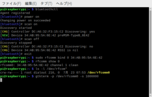 - 2) $ sudo rfcomm bind [シリアル番号] [Bluetooth Device Address]