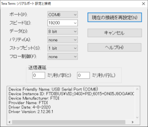 - シリアルポートと通信スピードを設定します(以下、TeraTermを例として説明します)。