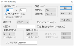 ボーレート:19,200bps、データ長:8、ストップビット長:1、パリティ:なし、フロー制御:ハードウェア(BUSYのみ) - 次に、端末設定を変更します。改行コードの送信側をCRのみからCR+LRに変更します。また、ローカルエコーに✔を入れます。これにより、入力したコマンドが表示されるようになります。