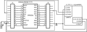 UARTで接続します。図3に接続図を示します。センサモジュールのUART2コネクタのRX信号、TX信号をそれぞれ、IMC920c用変換アダプタのJ1コネクタのTxD信号、J2コネクタのRxD信号にクロスで接続します。UART2コネクタのGND信号は、J2コネクタのGND信号に接続します。UART2コネクタのVIN端子は使用しません。