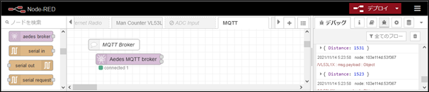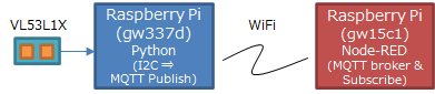 VL53L1XをI2Cで接続したRasberry Pi(gw337d)とgw337dからPublishされたデータをMQTT ブローカーで受けるRasberry Pi(gw15c1)でシステムを構成する。
