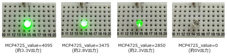 MCP4725は1ポートのDAコンバータ出力を持っており、設定した電圧を出力することができます。ここではこの出力ポートを使用してセンサモジュールに外付けしたLEDにかける電圧を変化させてみます。通常はLEDの明るさを変える場合はPWMを使用しますが、出力電圧が変更できるのを視覚的に見るためにこの事例を紹介しています。