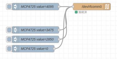 最大値の4095以外にも、中間値の3475, 2850, そして0の値をコマンドで送信するノードを追加してみましょう。