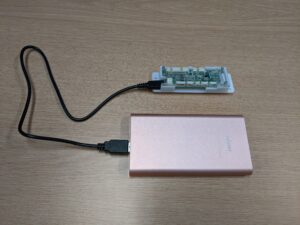下の写真は、携帯用USB電池(20,000mAh)を接続した事例です。計算上は8日間以上の連続運転が可能です。