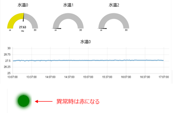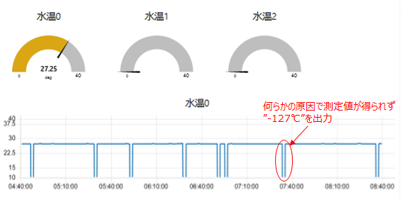 具体的には、海産物の養殖水槽に取り付けた水温センサ(DS18B20)のデータが、図1のようにたまに測定できず外れ値を表示することが分かりました。この外れ値の発生頻度をモニタし、通常と異なる頻度を示した際には異常を連絡するシステムを構築しました。