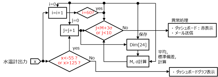 ・ 水温センサDS18B20の測定範囲は、-55℃~125℃までなので、-55℃より小さいもしくは125℃より大きい出力値を外れ値とする(図2 異常検出フロー参照)